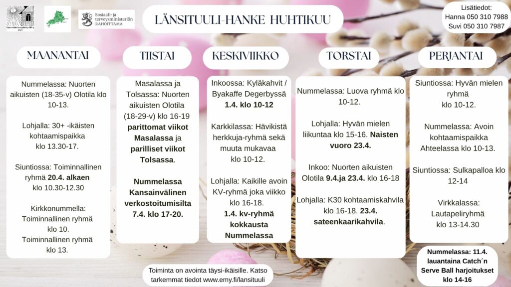 Emylle on myönnetty STEA:lta hankerahoitus vuosille 2024-2026. Länsituuli-hanke keskittyy kohtaamispaikkatoiminnan kehittämiseen Kirkkonummella (Kirkkonummen seudun mielenterveysyhdistys KISU ry:n kohtaamispaikka Kimi osoitteessa Eerikintörmä 2) sekä mielenterveyttä tukevien ryhmätoimintojen käynnistämiseen Kirkkonummella, Vihdissä, Lohjalla, Siuntiossa ja Inkoossa. Vuonna 2026 toimimme myös Karkkilassa Länsi-Uudenmaan hyvinvointialueen myöntämän avustuksen mahdollistamana.